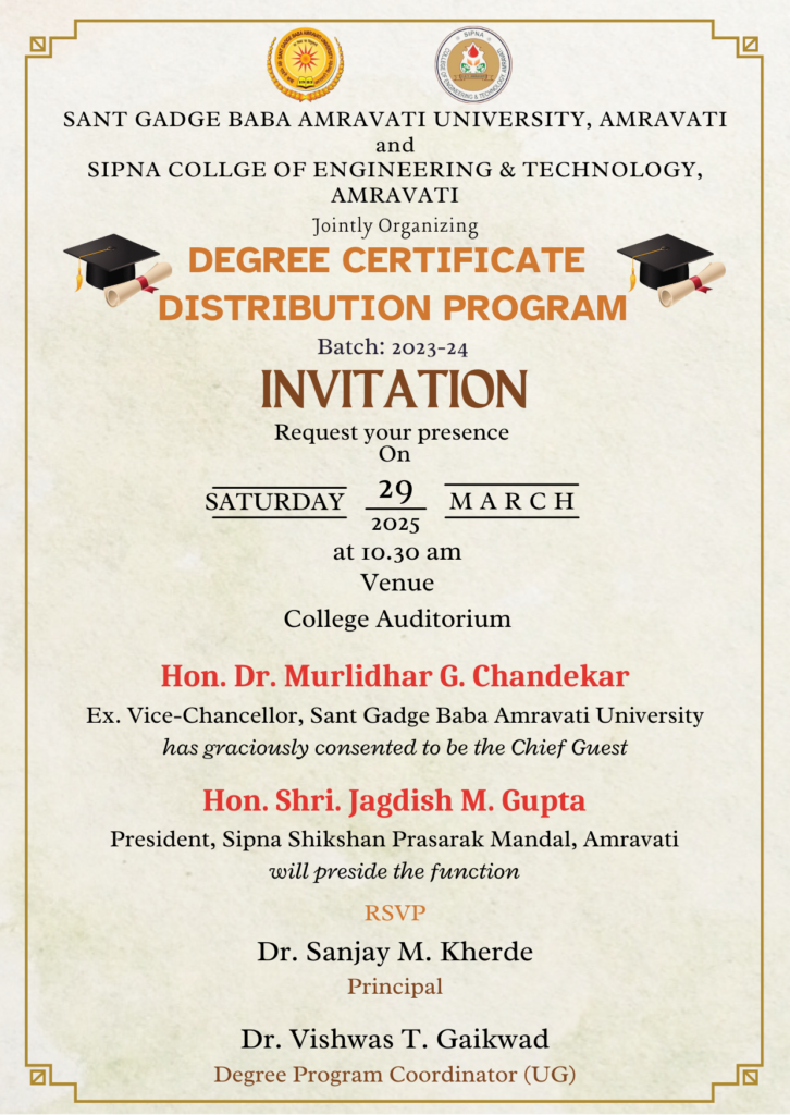 As per SGB Amravati University guidelines, the Degree Certificate Distribution Program for the 2024 batch was held at Sipna College of Engineering & Technology, Amravati, on Saturday, 29th March 2025, in the college auditorium.