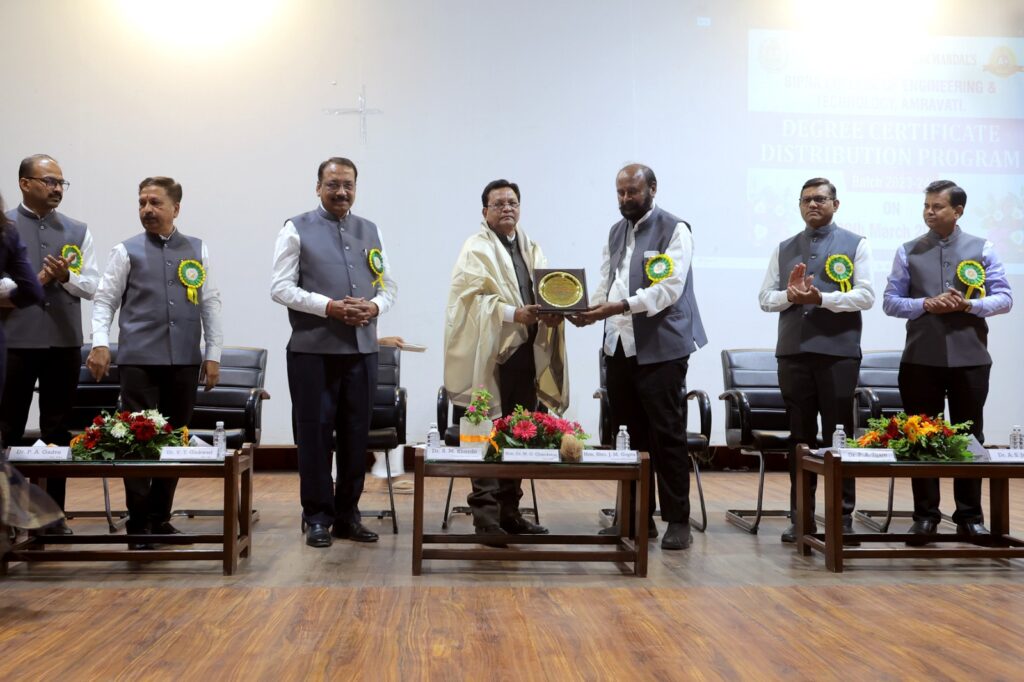Dr. Murlidhar G. Chandekar, Ex-Vice-Chancellor of SGBAU, was the Chief Guest. Hon. Shri Jagdishji M. Gupta, Chairman of Sipna Shikshan Prasarak Mandal, presided over the function, joined by Principal Dr. Sanjay M. Kherde and degree coordinators of B.E., M.E., Ph.D., and MBA programs.