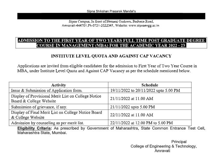 Applications are invited from eligible candidates for the admission to First Year of Two Year Course in MBA, under Institute Level Quota and Against CAP Vacancy as per the schedule mentioned